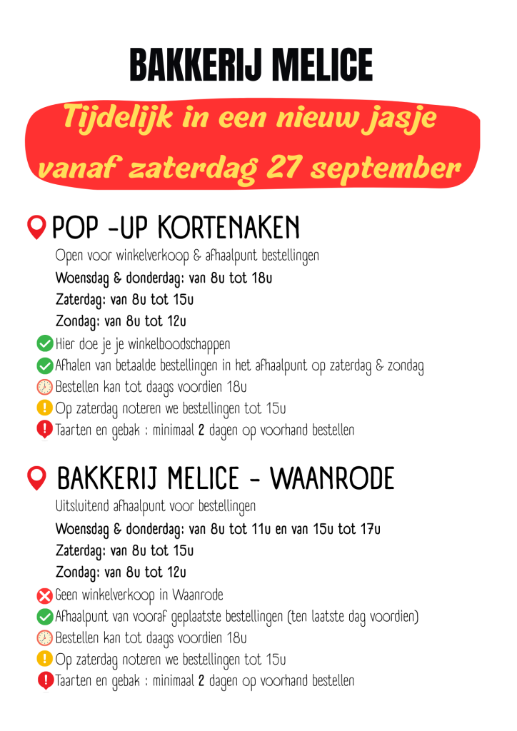 We zijn blij en trots om aan te kondigen dat Bakkerij Melice vanaf 27 september een pop-up locatie in Kortenaken opent. (Voorheen Bakkerij Vanderlinden: dorpsplein 19 – Kortenaken) Zo brengen we ons versgebakken brood, knapperige koffiekoeken en specialiteiten dichter bij jullie thuis.